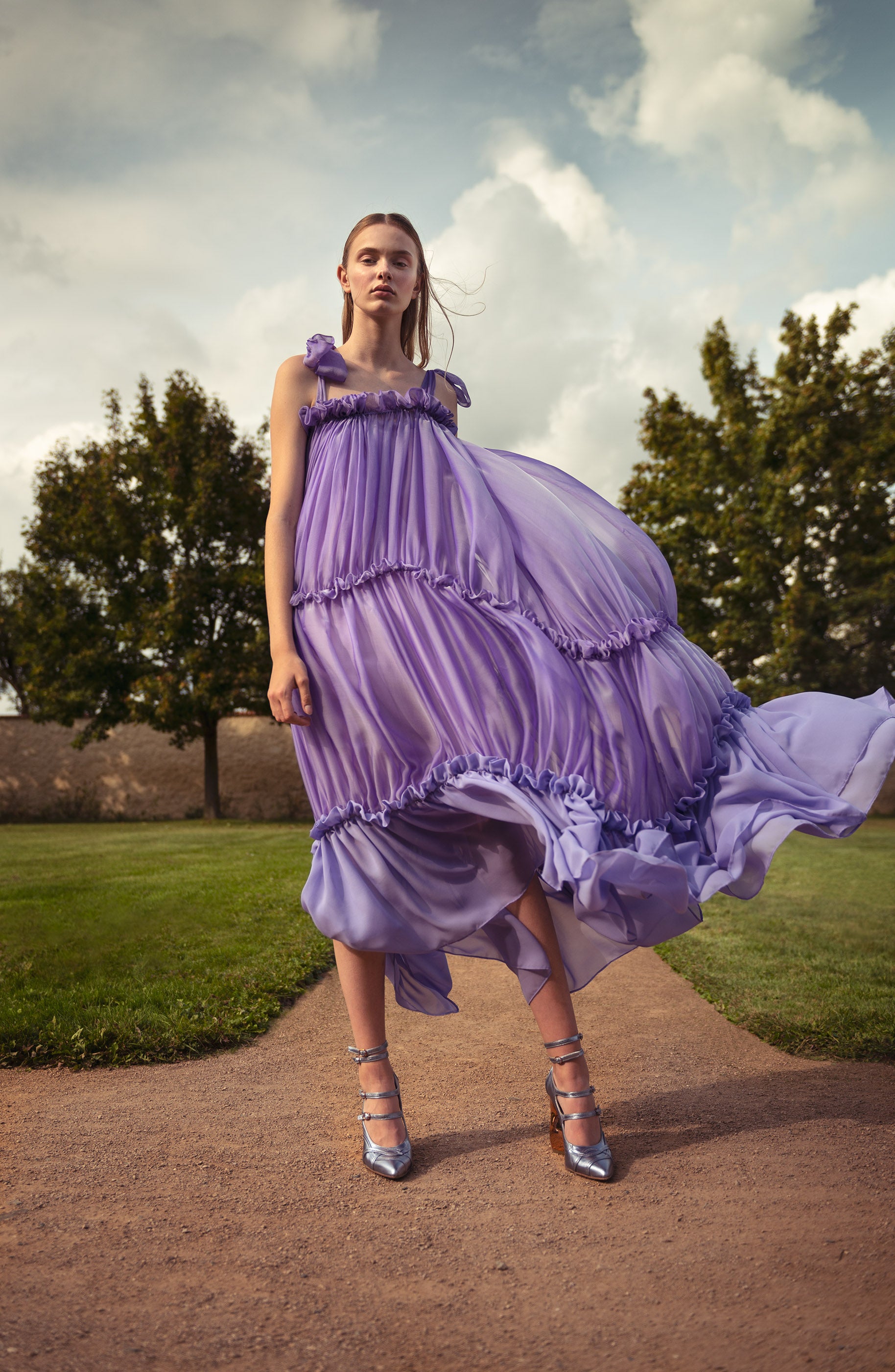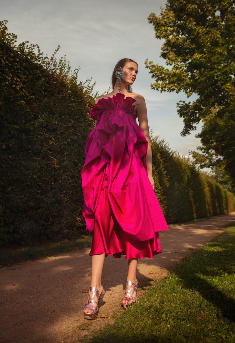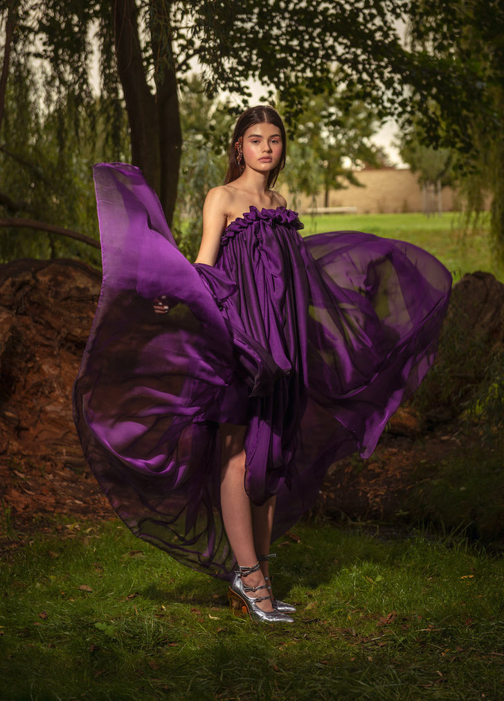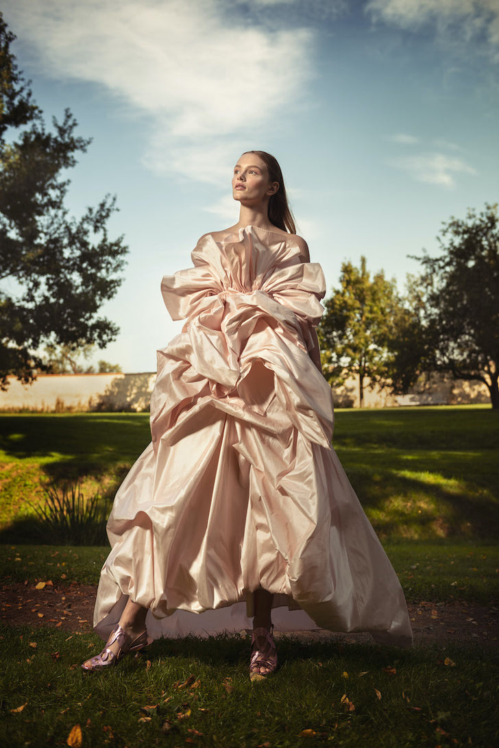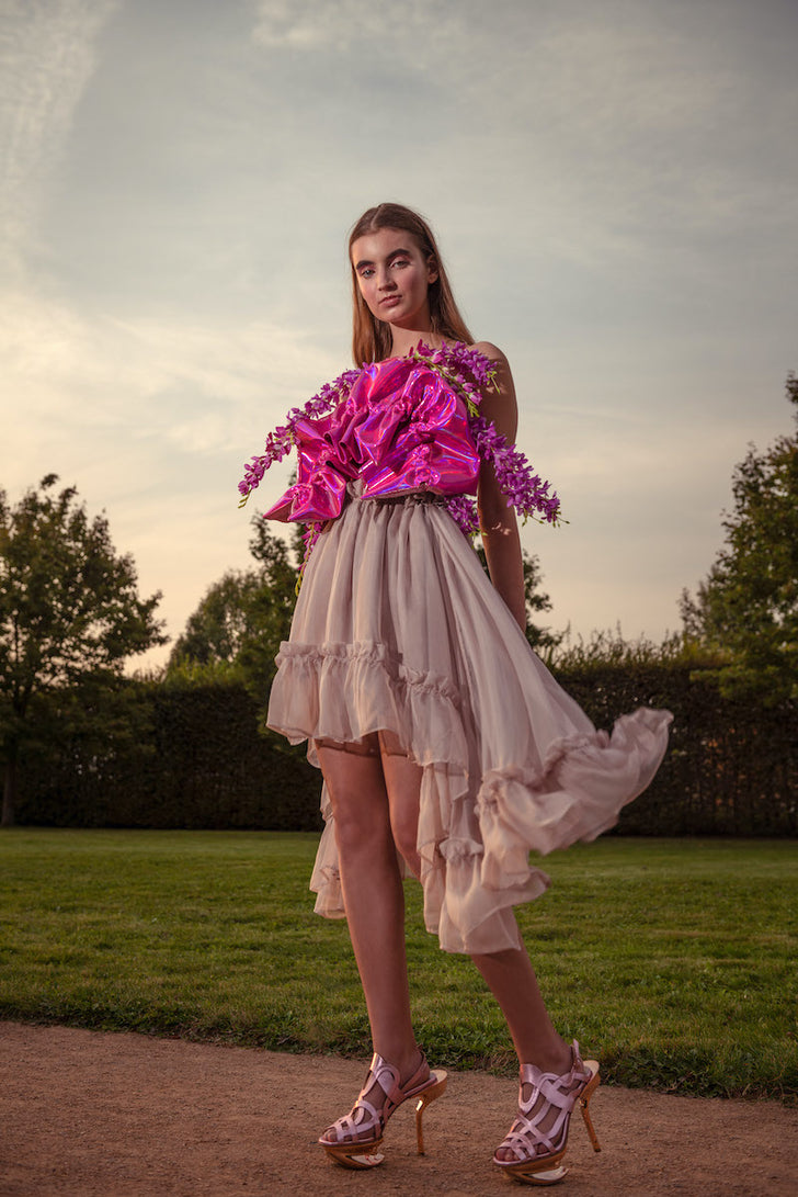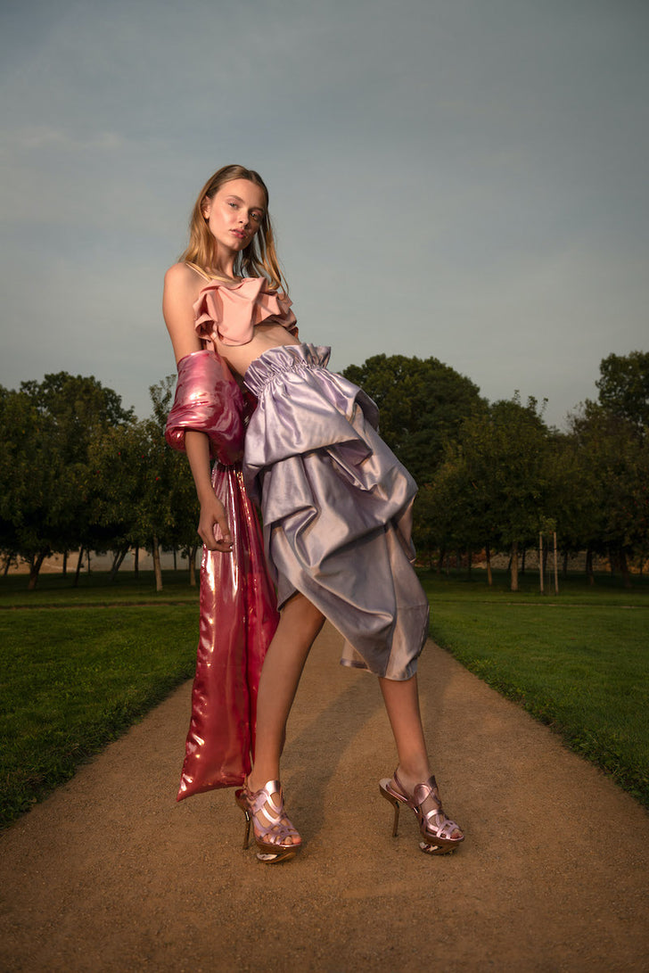 Nymphae builds on Dufka's previous work in the expressiveness of oversized forms. Instead of jackets and fashion objects it works for the first time with the theme of large evening gowns. They are also characterized by a moment of surprise, which we encounter across its portfolio. At first glance, dreamy sculptural forms in shades of fuchsia, dusty rose or purple are undermined by elaborate folds, shiny materials and eccentric accessories.